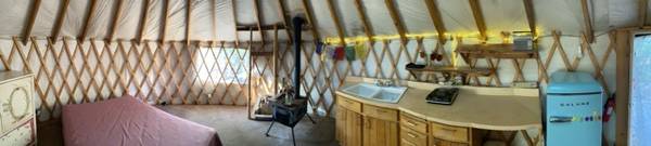 Cute unfurnished YURT with all-natural earthen floor and custom opening skylight. It’s a 16’ diameter/200 sq ft. Has a small kitchen with custom wood cabinets/countertop and small fridge, wood stove (the only heat source), and ethernet. Hand built front porch/awning adds outdoor covered space. Bathroom is a short walk to an ample community space along with a larger, shared kitchen (with many appliances). Land internet is 20Mbps down, 10 Mbps up. It’s available in and around the shared barn, as well as at certain homesites.