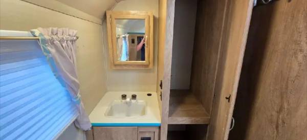 This unit is a Vintage style coach with a full bathroom, microwave, refrigerator, and gas range top. It has an RV Queen Murphy bed with a small closet. It has a 13,500 btu gas furnace and a roof mounted AC unit. Renter removes all trash. Renter supplies water, propane, battery and small generator.