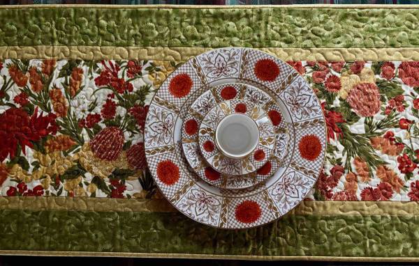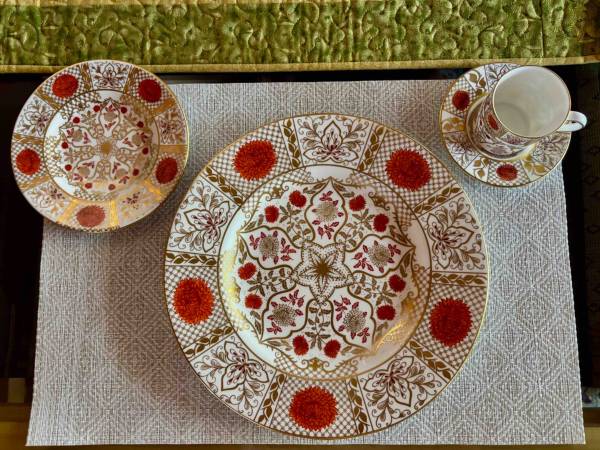 Abbeydale Imperial English Bone China - Vintage (produced between 1962-1974). Set of 10 place settings available at $175 per setting. This bone china pattern was sold by Tiffany & Co. in the U.S. and has an Imari-style pattern of 22 kt gold panels and orange/red chrysanthemums.