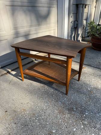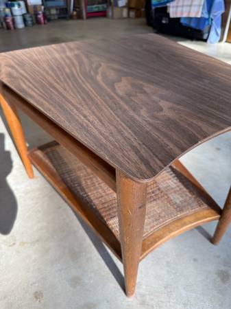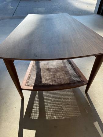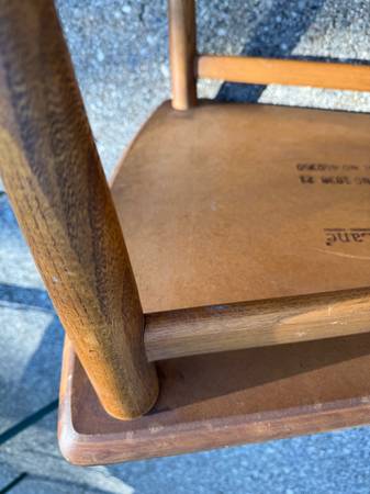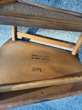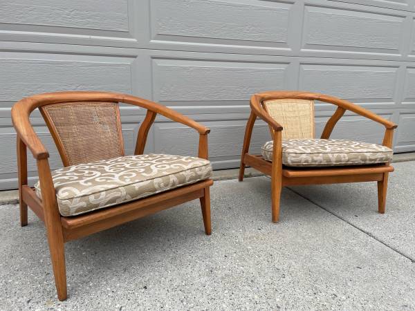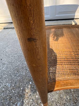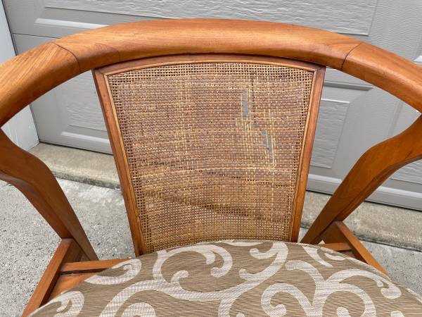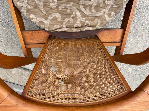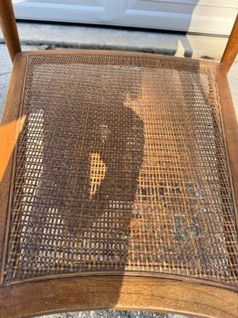 1950’s teak/cane mid century modern chairs. Partially restored. One chair needs the cane replaced. My parents bought these new in the late 1950’s. Matching Side Table. No scammers. Serious inquiries...