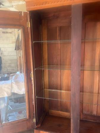 Armoire/cabinet with beveled glass doors. Antique walnut 3 plate glass shelves 2 drawers with ornate pulls. 86 1/2” height. 53 1/4 width 17” deep.
