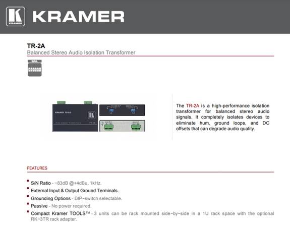 I have a huge lot of professional audio and networking equipment to sell. Here is a new Kramer TR-2A Balanced Stereo Audio Isolation Transformer. I have more than one of these.