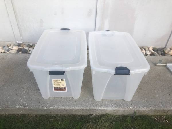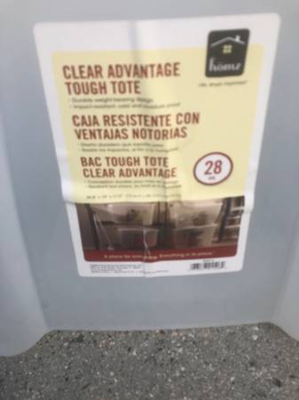 Clean, very large clear heavy-duty 28 Gallon sizes. Snap-On lids. $25 for Both; CASH only. Click on "include more ads by this user" to see what else I have for sale.