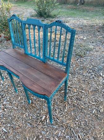 Elegant farmhouse, French country style bench, custom-made with a creamy chalk paint finish and wax detailing. Beautiful attention to detail with hand turned wood legs and back. Aged to perfection. Perfect for a chic entry hall under a wall display of vintage hats or as a centerpiece in your garden or on your porch! Price is firm.