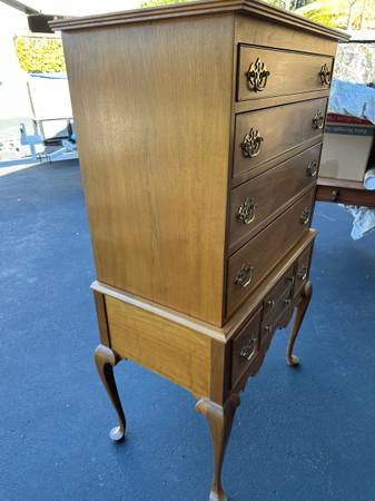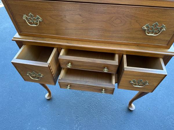 Dresser is two parts; top with drawers and bottom with drawers and legs. Dresser has four top drawers ranging in size from about 4" to 6" inches. Bottom half has numerous drawers as shown.