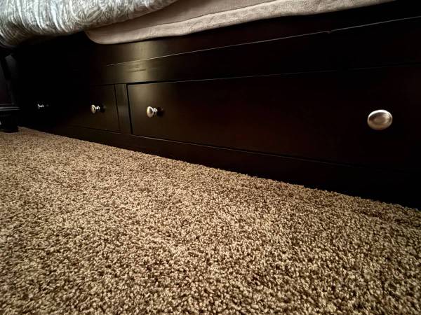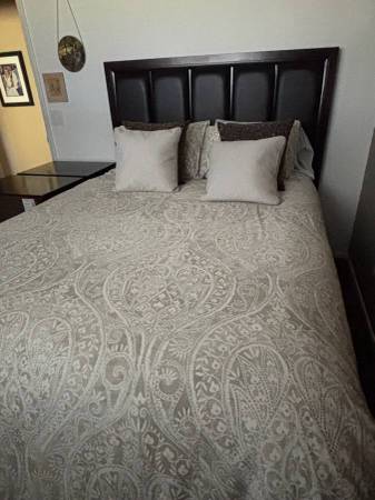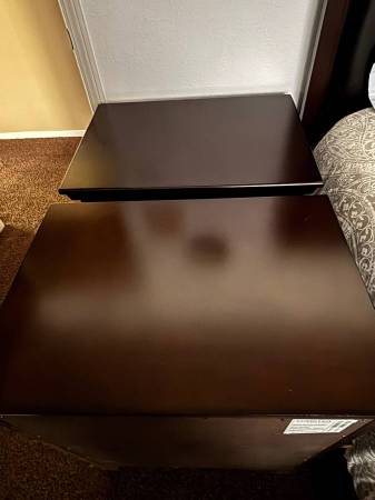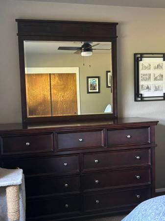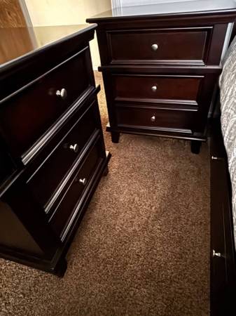 This bedroom set is in a guest room, not used often. So the set is gently used. It is dark wood. The bed is queen size, with two drawers on each side, below mattress and boxspring. Comes with headboard and footboard. Mattress and boxspring included. Set includes two nightstands with three drawers each. The dresser with attachable/detachable large mirror, is tall. Has three smaller drawers in a row; six larger drawers side-by-side below smaller drawers. Have taken great care of this set. However, it is too big for bedroom, therefore I want to buy something smaller...... Pair of lamps additional $80 text via show contact info