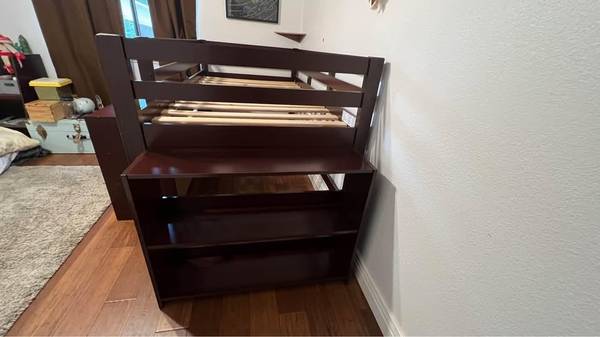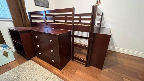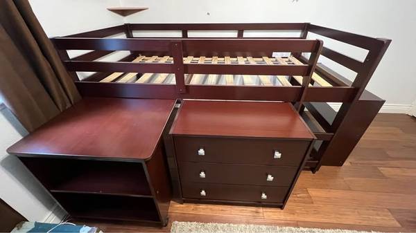 Awesome loft bed with book shelves, and slide out desk with shelves. ((Does not come with dresser pictured here). In perfect condition. Fits twin size mattress. Shelves and desk slide underneath. Great compact design especially for small rooms. Has been mostly disassembled for easy transport.