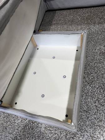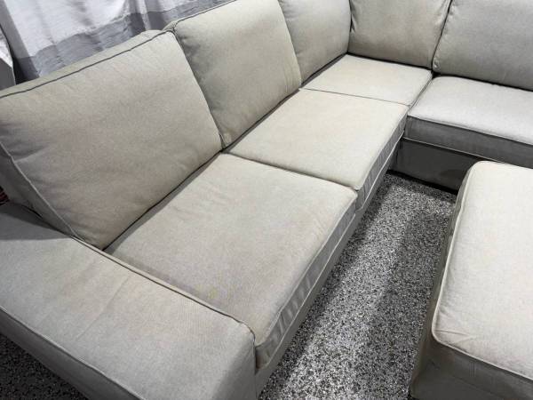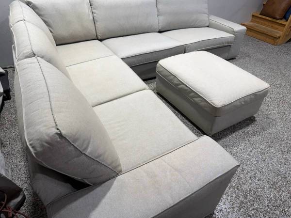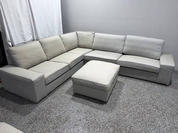 This is a 3 piece sectional couch and ottoman with storage. Overall in good shape with no stains or tears, just normal wear. Cushions are still really plush and comfortable, with all covers also being removable for a wash. Movable ottoman to kick your feet up and to be used for storage. It has been cleaned
