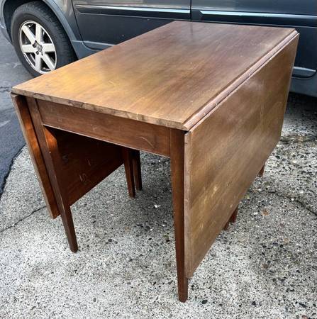 Beautiful Federal Style Drop-Leaf Dining Table. Great structural condition with scratches and stains in the finish. Measures 42” wide x 24-66” long x 30” tall.