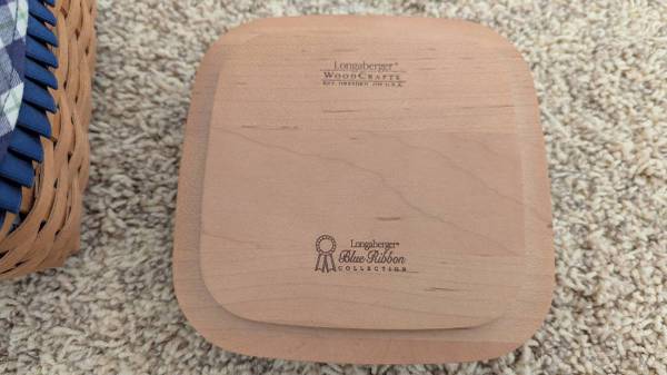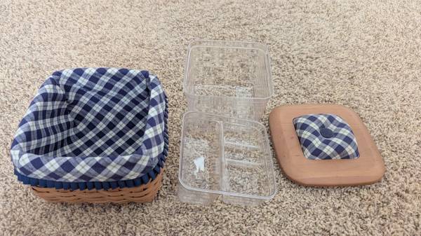 Longaberger Blue Ribbons hand-made baskets square with lid, 2 original plastic liner & fabric Signed LAW 2004