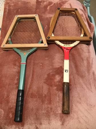 Vintage tennis racquets circa 1960 🤷♂️. I’m asking $5.00 dollars apiece or best offer. They appear to be in good condition. I don’t play tennis so what do I know. My name is Rich and I can be reached at show contact info