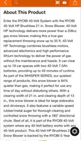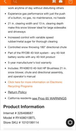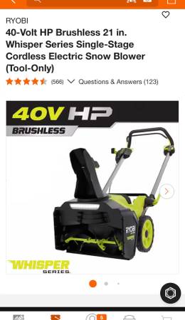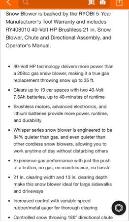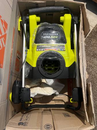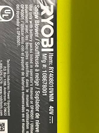 I have a BRAND NEW Ryobi 40v brushless snowblower with the chute/directional attachment in the box. It didn't come with any batteries or charger it was bought (tool only) but they are available online pretty cheap. It was a gift but I am currently living below snow level now so I don’t have a need for it and won’t really use it but it could make someone’s life a lot easier. So I’m hoping one of you out there wants one, needs one and can use it! I put the exact model and description in the pics. This is what was paid for it $449 (tool only) +tax.