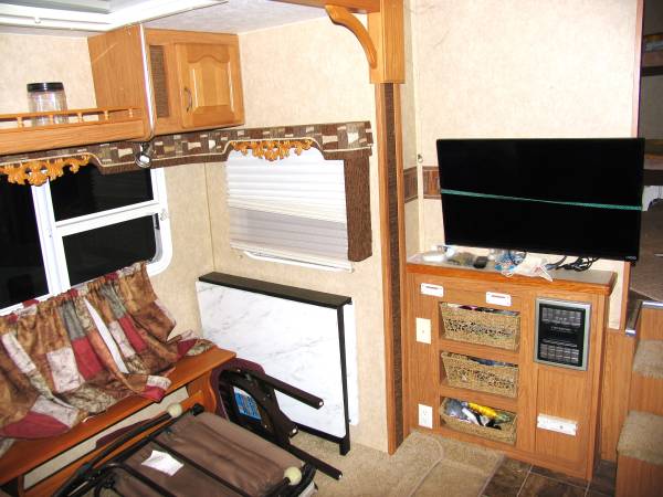 Front and back electric heavy duty stabilizer jacks. Everything works great on this trailer. Addition small refrigerator. Tires (with covers) are also in great shape. New foam mattress. Two propane tanks 32 liter (8.5 gal) eacg. Entry assist handle. Electric brakes on all four wheels. Spare tire.
